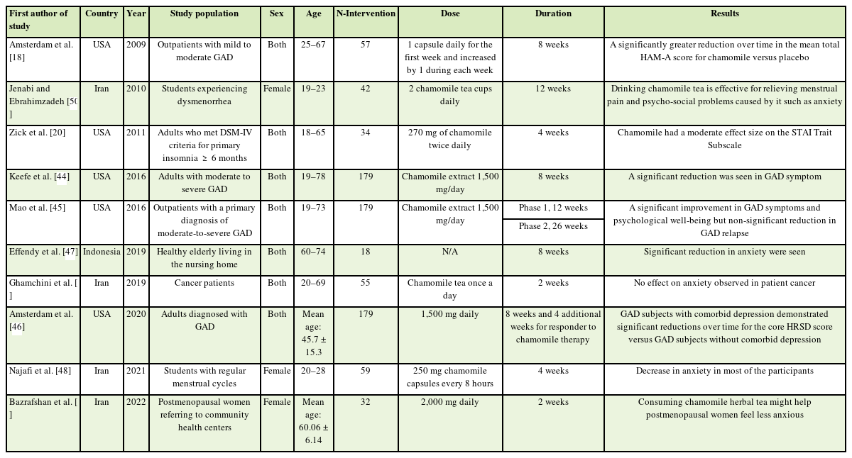 To the best of our knowledge, this systematic review is the most comprehensive and updated study available that examines the effects of chamomile on anxiety both in people with anxiety disorders and in relieving anxiety in other groups, for example, young women with dysmenorrhea or postmenopausal women. Summarizing the results in this way can give us a comprehensive view of the effects of chamomile on the state of anxiety. On the other hand, due to the diversity of the studied population, the possibility of heterogeneity in the studies has increased and meta-analysis was not possible. It seems that there is still a need for research on the effects of chamomile on anxiety. It is suggested that future studies should be conducted with a larger sample size and a better design, and the aim of the studies should be to find the effective dose of chamomile in reducing anxiety.