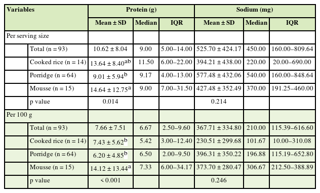 In this study, there were no significant differences in sodium content or contribution to DRI among staple senior-friendly foods by type, but the INQ of sodium was significantly greater in mousse and porridge than in rice. These findings suggest that rice is a good choice for reducing sodium intake when choosing staple foods for elderly people. In this study, the sodium content and contribution to DRI were significantly greater in sauces and braized·steam·roast products, while the sodium INQ was significantly greater in broth. Choi et al. [