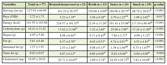 Table 1. The average serving size of a staple food product was 163.27 g, the price was 3.25 US dollars (4,498.38 won), and the energy content per serving was 295.25 kcal. Cooked rice had the greatest serving size, price, energy, carbohydrate, and cholesterol content, but the trans fat content was significantly greater in mousse (p < 0.05).