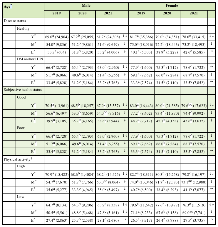 The inclusion criterion was Korean adults aged 19 and over. The subjects were divided into 3 age groups within the male and female categories: 19–49 years (young), 50–64 years (middle-aged), and 65 years and over (elderly), which was similar to the tertile distribution of all populations. Thus, participants in this study were divided into the following subgroups: the healthy group vs. the diabetes mellitus (DM)/hypertension (HTN) group; the good subjective health status group vs. the poor subjective health status group; and the high physical activity group vs. the low physical activity group.