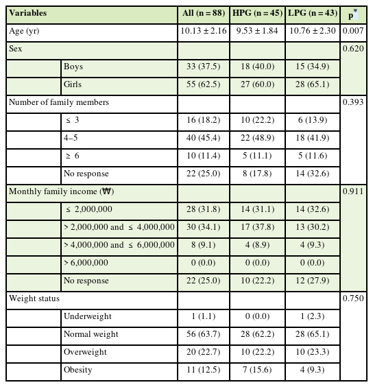 This study selected community childcare centers through official communication with the local government of Gyeonggi province. Participants were recruited from children and adolescents registered in the selected community childcare centers, and subjects were assigned to respective groups based on their desired participation in the centers. A total of 118 individuals aged between 7 and 17 years were recruited, and information regarding their general characteristics was obtained. For the analysis, a total of 88 participants who did not withdraw from the community childcare centers or refuse to participate in the education were included. This study aimed to conduct a 12-month health education program, including nutrition, exercise, and psychological education, to improve lifestyle habits among children and adolescents using community childcare centers in South Korea. The study received approval from the Institutional Review Board of Hallym University Sacred Heart Hospital (approval No.: 2016-I135). All participants and their parents or guardians were informed about the study and provided consent. Previous studies have used the median visit to categorize participants into high participation group (HPG) and low participation group (LPG). In this study, referring to a previous research, the median participation ratio was determined as 83% [