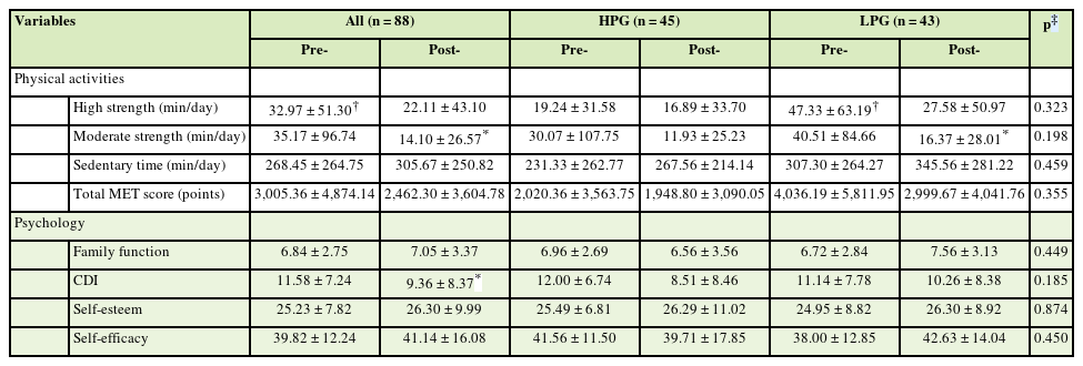 29]. Notably, the LPG exhibited a significant decrease in the duration of moderate-intensity exercise. This decline may be attributed to the lack of interest in physical activities at home among children and adolescents utilizing community childcare centers [