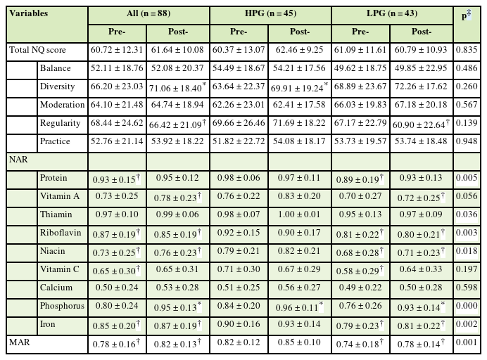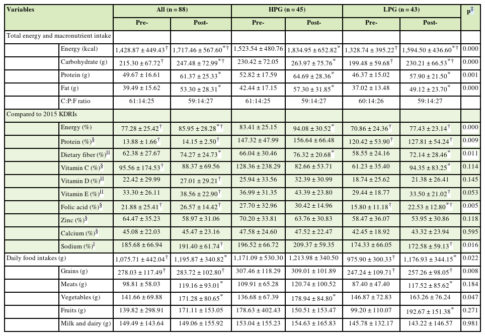 30]. However, many of these nutritional factors showed improvements or positive changes after the education program, regardless of the group. The findings suggest that both the LPG and HPGs made efforts to acquire and implement basic nutritional knowledge through education.