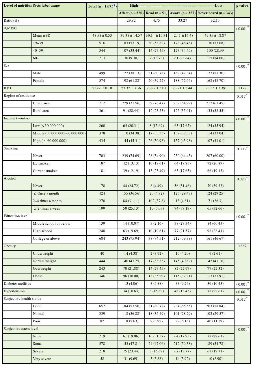 Globally and in Korea, for people of all ages, NFLs provide easy-to-access nutrition information and are an effective and powerful health promotion tool to help people make healthy food choices. According to previous studies, patients who ate diets lower in fat, as well as patients who ate diets higher in fruits, vegetables, and fiber, were much more likely to use NFLs to guide their food purchase decisions than patients whose diets were higher in fat (51% vs. 26%). Therefore, the level of NFL utilization is directly related to high-quality food intake and nutritional status [