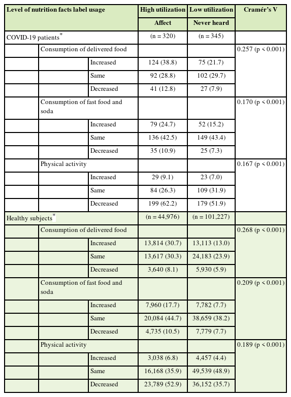 The major limitation of this study includes the inability to analyze how COVID-19 patients’ nutrition intake were affected by nutritional facts. Whether the NFL was accurately interpreted and how it influenced food choices (e.g., whether high-calorie foods were replaced with low-calorie foods or whether foods with high or low levels of certain nutrients [simple sugar, saturated fat, protein, minerals, etc.] were selected) remained unknown among confirmed COVID-19 patients and healthy individuals during the pandemic period. In addition, an actual nutritional intake analysis was not conducted; therefore, the current study could not investigate nutritional intake or nutritional risk according to the utilization of NFLs. Therefore, to enhance readers’ in-depth understanding, we included a brief discussion on whether the increased NFL usage positively influenced actual dietary intake.