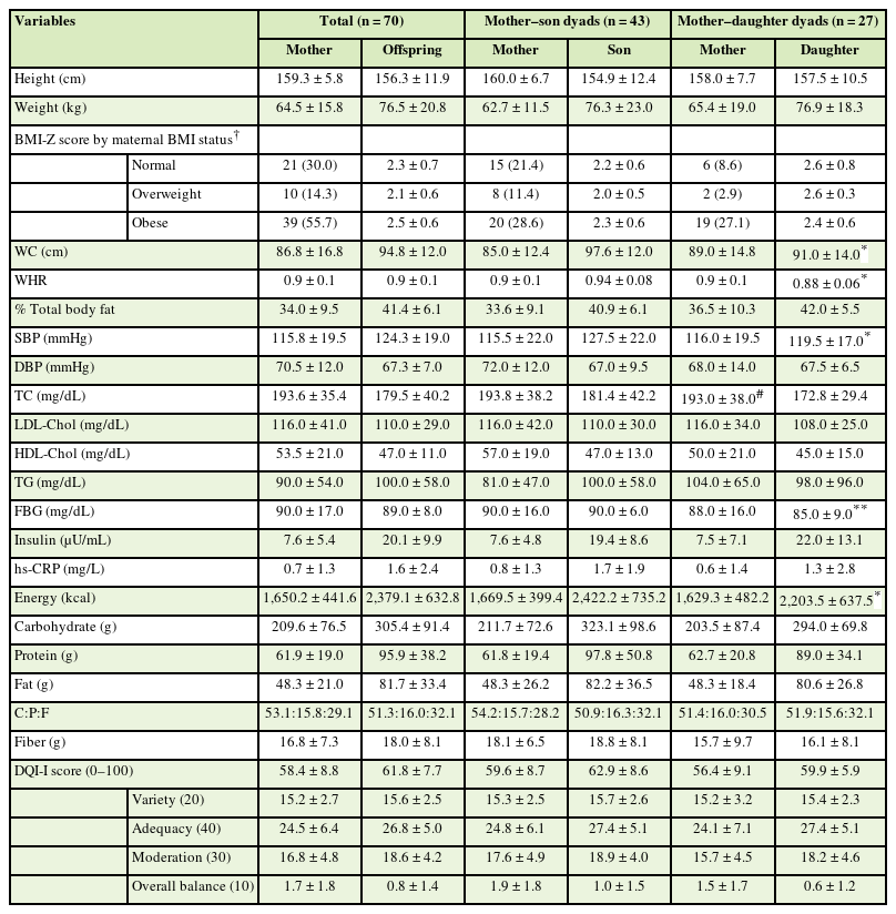 We analyzed baseline data collected from the Intervention for Children and Adolescent obesity via Activity and Nutrition study approved by the Institutional Review Board (IRB) of Hallym University Sacred Heart Hospital (IRB No. 2016-I135). The participants were recruited in January–September 2016 through advertising modalities or by school nurses in Seoul (metropolitan) and Gyeonggi Province (satellite city) in South Korea. The study population included children or adolescents with obesity and their mothers. We excluded participants with missing anthropometric, biochemical, and dietary intake data for children and their mothers. We also excluded individuals with poor literacy. In total, 70 eligible dyads that included children and adolescents aged 8–16 years were recruited. Written informed consent was obtained from both mothers and children. Childhood obesity was defined as age- and sex-specific body mass index (BMI) ≥ 95th percentile based on the 2007 Korean National Growth Charts (Korea Centers for Disease Control and Prevention, 2007).