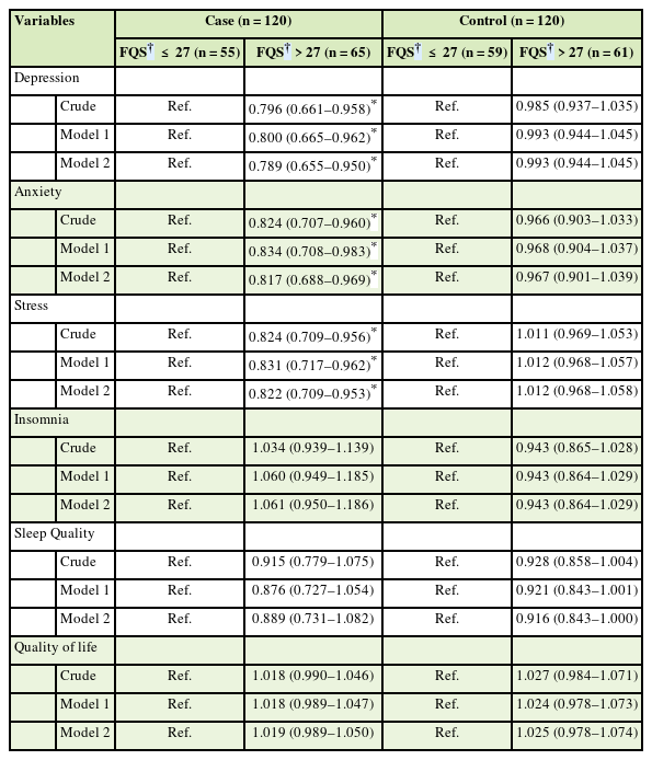 Supplementary Table 1). However, no significant association was seen between fruit intake and anxiety, stress, sleep pattern, and quality of life in the two groups (p > 0.05). There was no significant association between vegetable intake and psychological function score in two groups (p > 0.05); However, daily intake of whole grains (β = −0.276, p = 0.022; β = −0.377, p = 0.001; β = −0.300, p = 0.013), nuts and legumes (β = −0.216, p = 0.045; β = −0.232, p = 0.042; β = −0.226, p = 0.033) indicated a reverse significant correlation with depression, anxiety, and stress, respectively only in case subjects (