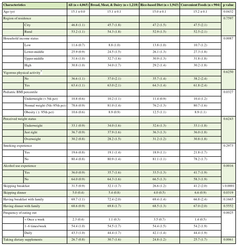 Table 1Dietary pattern analysis using cluster analysis: mean percentage of energy intake from food groups among Korean adolescents