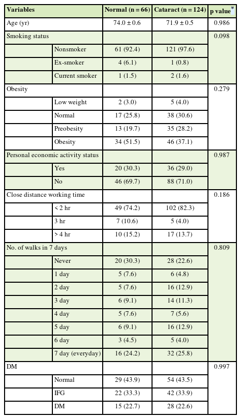 Table 2. A total of 190 women aged 60 to 79 years were included in the analysis, comprising 66 individuals in the normal group and 124 in the cataract group. The mean age was 74.0 years in the normal group and 71.9 years in the cataract group.