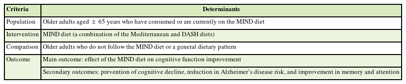 Therefore, this study aimed to systematically review the existing literature to clarify the effect of the MIND diet on the cognitive function of older adults. The findings may serve as foundational evidence for the development of dietary guidelines tailored to the cognitive health needs of older Korean adults.