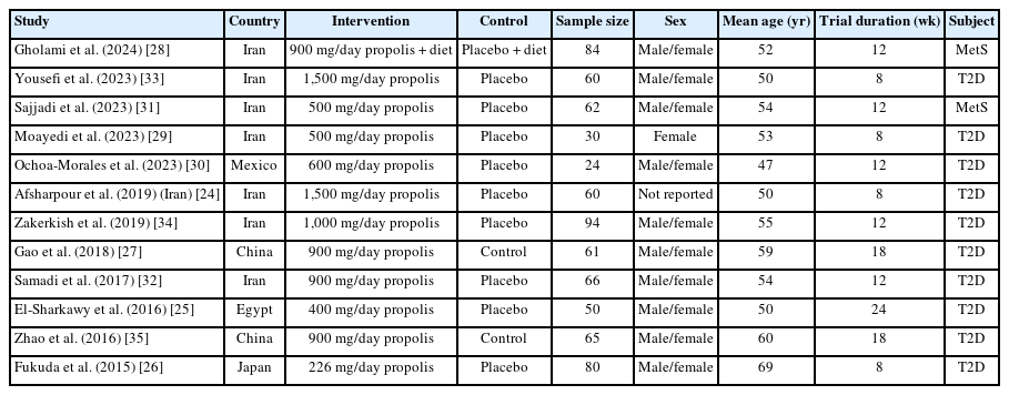 All identified articles were initially screened by title and abstract, followed by full-text review to determine eligibility. Two independent authors screened the studies separately, and any discrepancies were resolved through discussions with a third reviewer. Literature screening was performed using the EndNote X8 reference manager (Clarivate). The inclusion criteria for studies were as follows: (1) RCTs conducted in adults (aged ≥18 years) with T2DM or MetS; (2) investigation of propolis supplementation for a minimum duration of 1 week, with a control or placebo group included in the study design; (3) reporting of at least one relevant outcome, such as fasting blood sugar (FBS) levels or lipid profiles; (4) studies published in English. The exclusion criteria were as follows: (1) studies conducted in children, pregnant women, or lactating women; (2) studies reporting insufficient data; (3) trials that assessed propolis in combination with other compounds; (4) gray literature, including theses and conference abstracts. If the same trial was covered by multiple publications, the most comprehensive report was selected as the main reference.
