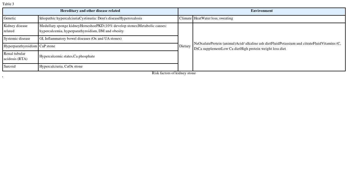 Keywords: Nephrolithiasis; Calcium oxalate; Uric acid stone; Hypercalciuria; Hyperoxaluria; Risk factors for kidney stones; Prevention of kidney stone
