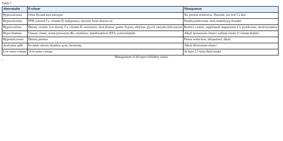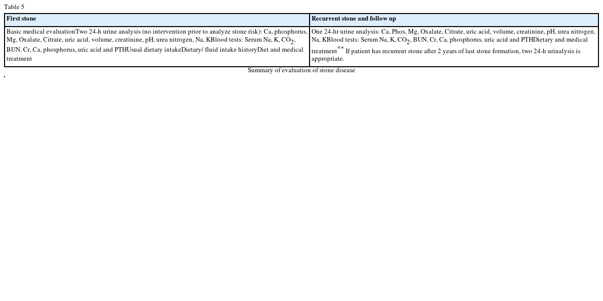 Table 4 shows the conditions that favor stone formation. Urinary crystalloids can form nucleus on the existing surface and supersaturate urine. Low urinary magnesium causes decrease complex formation with urinary oxalate allowing free oxalate to be more available in the urine. Low urinary citrate also increases stone formation because citrate forms a complex with calcium so free calcium is more available for stone formation. High concentrations of uric acids in the urine will promote the nuclei to start stone formation. If the patient is dehydrated, he or she will have low urine output and therefore the urine can be supersaturated. Urine pH is very important for the formation of some types of stones. For example, low urine pH is favorable to formation of CaOx and uric acid stones while a high urine pH promotes CaP stone formation.