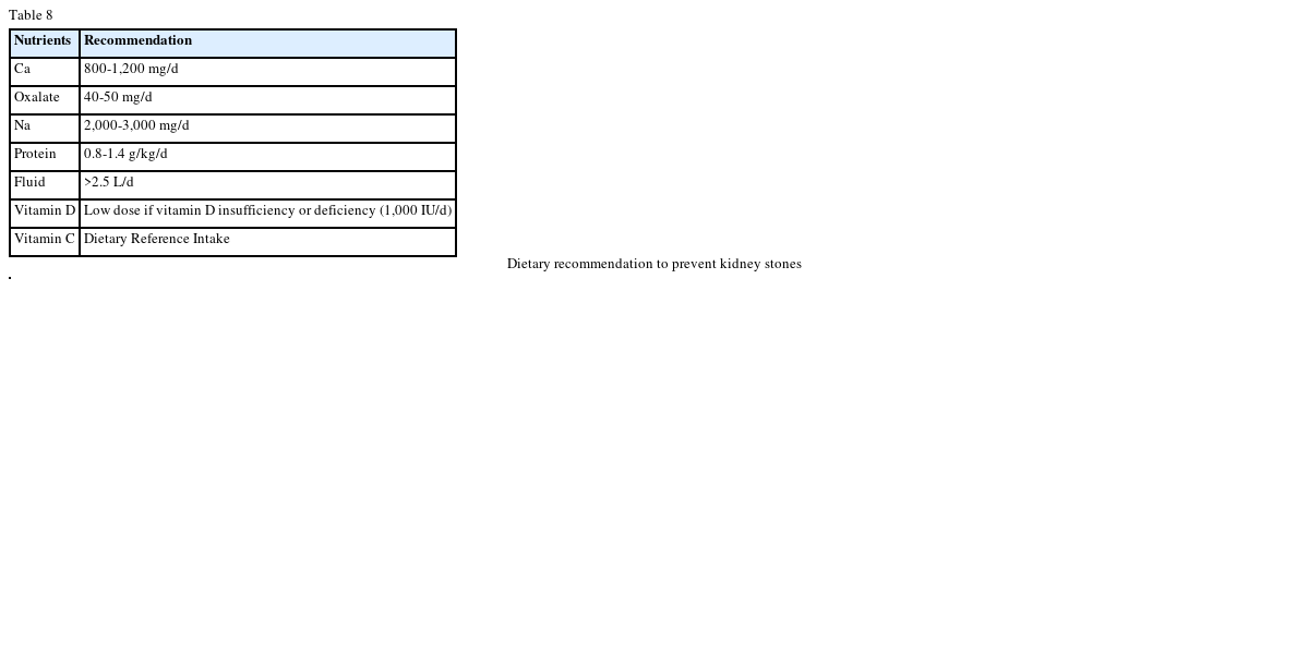 There are several dietary assessment methods: the 24-hour recall, food record diet history and food frequency questionnaire. The dietary intakes should be reflected on the urinalysis and it is good way to evaluate the causes of kidney stones and to prevent recurrence. Food records provide information on intake of foods, beverages, and dietary supplements over specific periods. The most appropriate diet assessment for kidney stones is the food record during a 24-hour urine collection, as well as 1-2 days before the collection. The food record should be analyzed to evaluate intakes of protein, sodium, potassium, calcium, phosphorus, magnesium, uric acid, oxalate and fluid. Based on the food intake and urinalysis, the clinicians can provide the adequate medical and diet treatments.