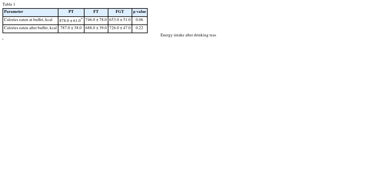 There was no significant difference in food consumption and energy intake during the lunch buffet among groups of drinking three different teas (Table 1).