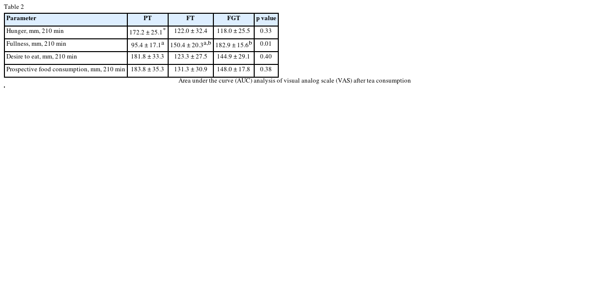 Subjects who drank FGT felt significantly less hunger than those who had PT (by two-way repeated measures ANOVA; p < 0.05), while those who drank FT showed no difference from PT and FGT. Fullness was higher in subjects who drank FT and FGT compared with subjects who drank PT. With respect to the subjects' desire to eat, subjects who drank FT recorded lower values on the VAS compared with those who drank PT, while subjects who drank FGT showed no difference from PT and FT. In addition, prospective food consumption was lower in subjects who drank FT and FGT than in those who drank PT.