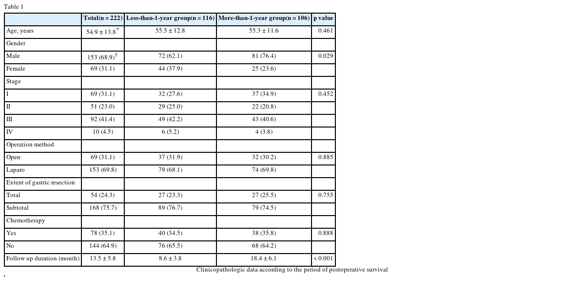 A total of 222 patients participated in the study; the mean age was 54.9, with 68.9% men and 31.1% women. A group of the less-than-1-year of post-operation, with a mean survival duration of 8.6 month, had 116 (52.3%) patients, and a group of the more-than-1-year of post-operation, with a mean survival duration of 18.4 months, had 106 (47.7%) patients. When the final disease stage was classified according to the 6