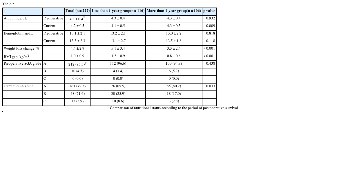 When indicators of nutritional status were compared between two groups of postoperative survival period, there was no difference in the serum albumin and hemoglobin levels, since these indicators were within the normal range in patient of both groups. The serum albumin level was significantly different after the surgery between two groups. The mean weight loss was 5.1% in the less-than-1-year group and 3.3% in the more-than-1-year group, and the difference was significant (p < 0.001). The pre-operative malnutrition rate for all subjects was 4.5%. After surgery, the rate of moderate malnutrition and the rate of severe malnutrition was 25.9% and 8.6% in the less-than-1-year group and 17.0% and 2.8% in the more-than-1-year group, respectively; thus, the malnutrition rate was significantly higher in the less-than-1-year group (p < 0.05) (