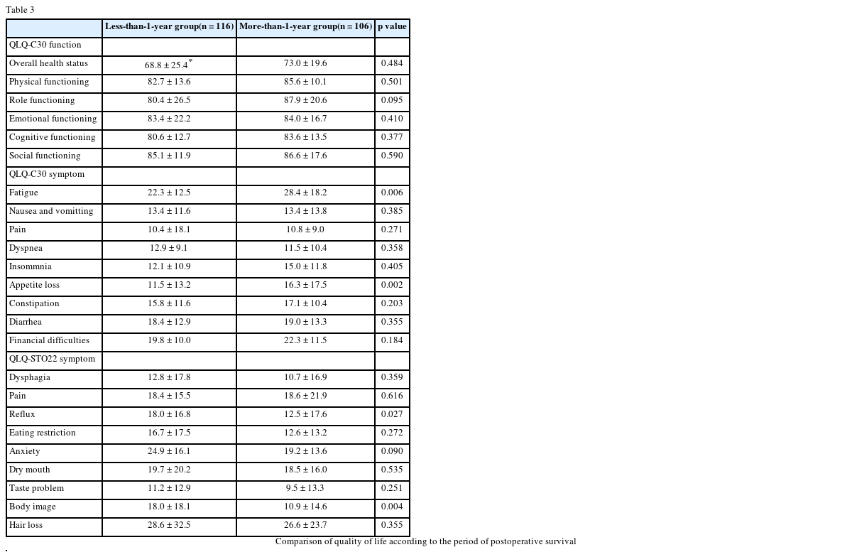 The overall health status considering the EORTC QLQ-C30 was lower in the less-than-1-year group, but the difference between two groups was not significant. When the 15 functional scales were compared, although the QoL considering the physical, emotional, congnitive and social function categories was lower in the less-than-1-year group than in the more-than-10year group, the difference between two groups was not significant. In the 9 categories pertaining to symptom scales, the QoL considering fatigue, pain, sleep disorder, loss of appetite, diarrhea and finalcial difficulties was lower in the less-than-1-year group but the mean scores for nausea and vomiting were the same. On the other hand, the QoL considering the dyspnea was higher in the less-than-1-year group than in the more-than-10year group. Among those symptoms, the symptoms that reached statistical significance were fatigue (p < 0.01) and loss of appetite (p < 0.01), in which the QoL was significantly lower in the less-than-1-year group. The QoL considering all the 9 categories of the QLQ-STO22 was lower in the less-than-1-year group, but the result was significant for only two categories of reflux (p < 0.05) and body image (p < 0.01) (