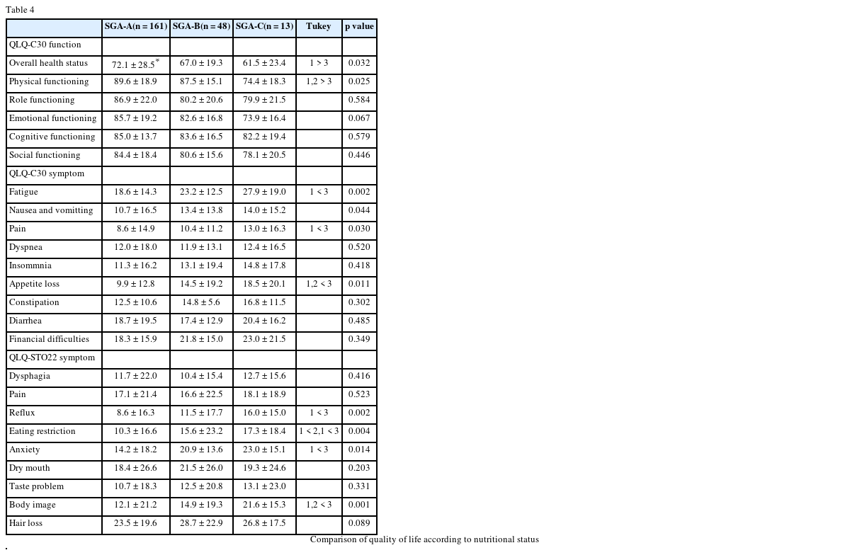 15]. In our study, the QoL was significantly lower in the SGA-C group than in the SGA-A group considering the overall health status including functional scales (physical functioning), and symptom scales (fatigue, pain, and loss of appetite) of the EORTC QLQ-C30, and the QoL in the SGA-C group was lower for considering reflux, eating restriction, anxiety, and body image scales of the QLQ-STO22. This is consistent with the results from other study for the nunutritional evaluation by using the nutritional risk screening (NRS) 2002, in which the QoL of the high-risk group with NRS ≥ 3 was significantly lower than that of other groups [