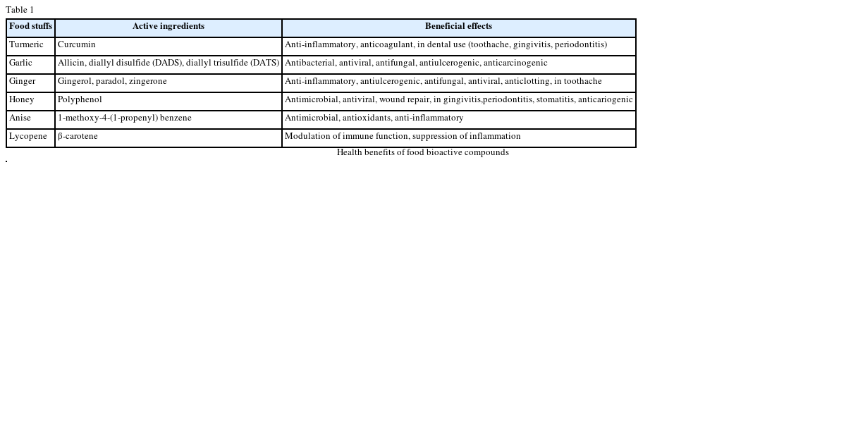 Oral health is responsible for social as well as physical well being of an individual. Routinely consumed food stuffs have a major impact on oral health. They are naturally bioactive and are composed of functional components like vitamins, minerals and antioxidants [