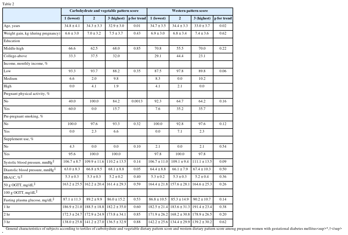 Table 2 General characteristics of subjects according to tertiles of carbohydrate and vegetable dietary pattern score and western dietary pattern score among pregnant women with gestational diabetes mellitus*,†