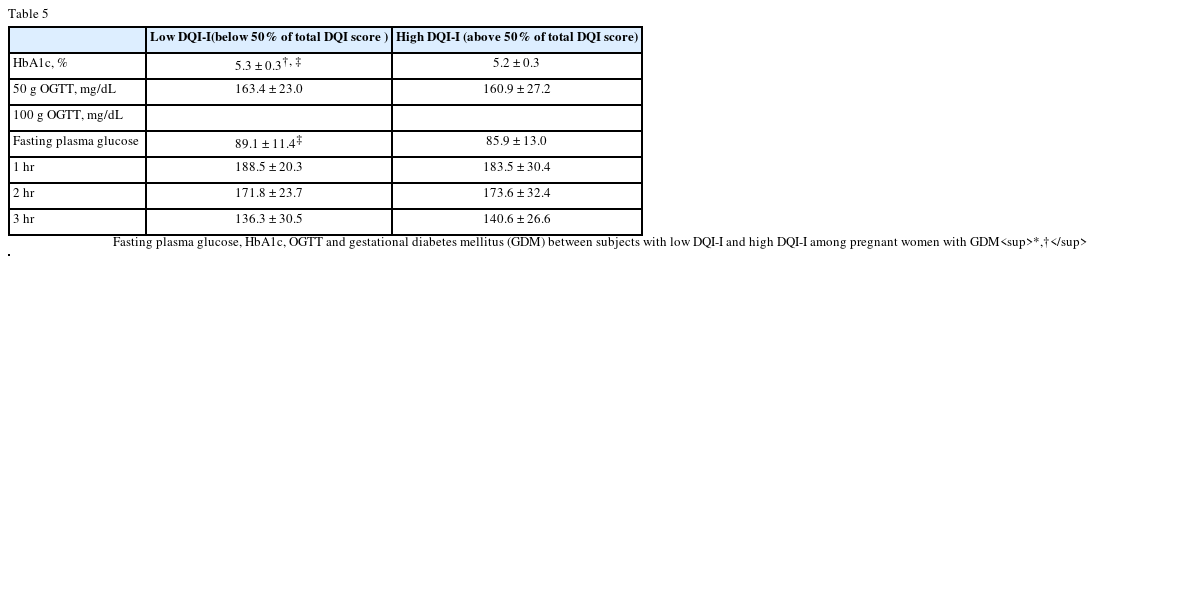 (above 50% of total DQI score)HbA1c, %5.3 ± 0.3†, ‡5.2 ± 0.350 g OGTT, mg/dL163.4 ± 23.0160.9 ± 27.2100 g OGTT, mg/dL Fasting plasma glucose89.1 ± 11.485.9 ± 13.0 1 hr188.5 ± 20.3183.5 ± 30.4 2 hr171.8 ± 23.7173.6 ± 32.4 3 hr136.3 ± 30.5140.6 ± 26.6