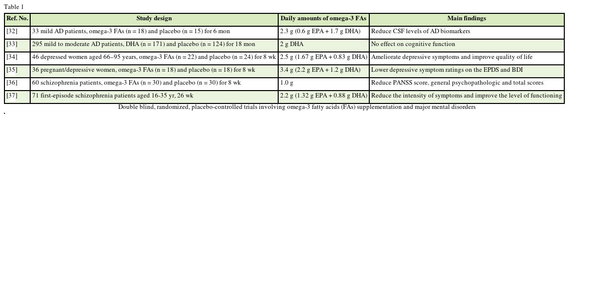 Table 1Double blind, randomized, placebo-controlled trials involving omega-3 fatty acids (FAs) supplementation and major mental disorders