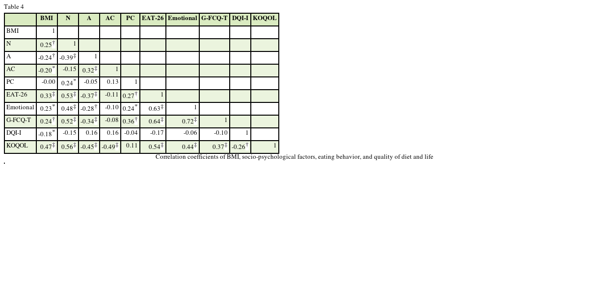 Table 4 Correlation coefficients of BMI, socio-psychological factors, eating behavior, and quality of diet and life